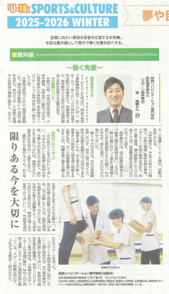 本校の認定理学療法士、旦 尚敏専任教員が2026/1/14の奈良新聞で紹介されました。